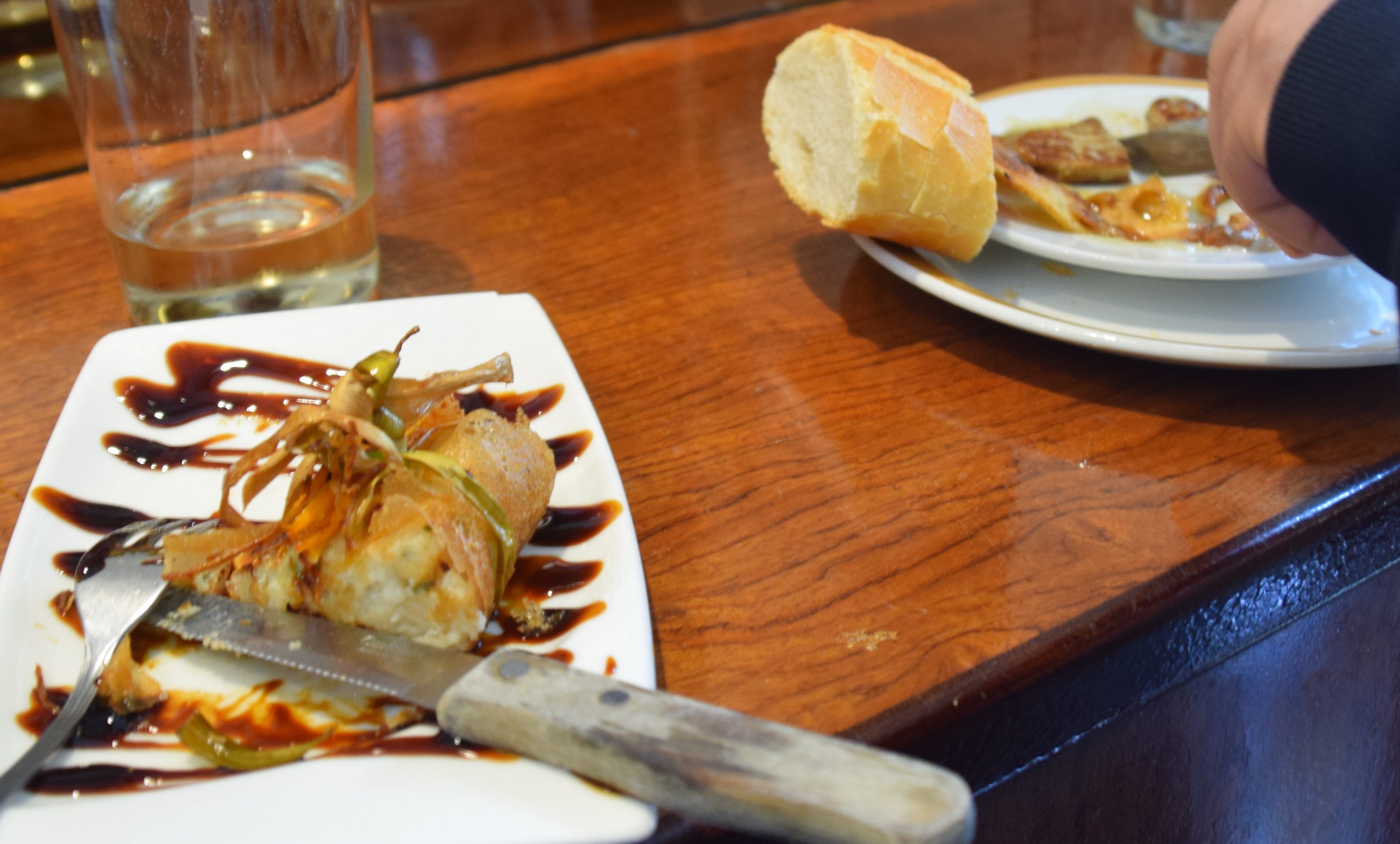 The second part of what turned out to be a nearly 6 hour tour was basically a pub crawl – visiting 5 different traditional pintxos bars, for a carefully well-matched drink and “snack” at each… foodie heaven! Showing us how to eat like a local – claim your ‘real estate’ when you walk in (a patch of counter or bar space – these are stand-up eating experiences); don’t take a plate or cutlery (unless what you’re eating really needs it), especially don’t treat the array of food like a buffet!