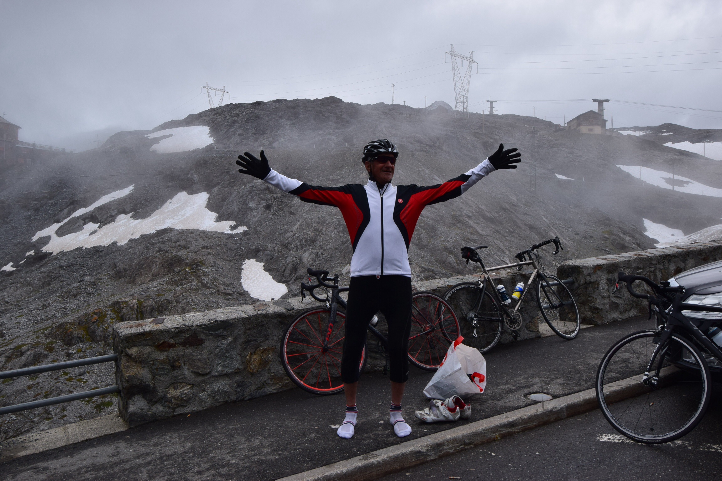 Good riding conditions. 16 degrees in the valley. 2 degrees at the top. COLD. No snow. And the signs counting the bends lie. They have removed the final steep ascent to stelvio replacing it with an extra switchback. And they have not renumbered. A typical sly Italian trick. You think you are on the home straight but no….
