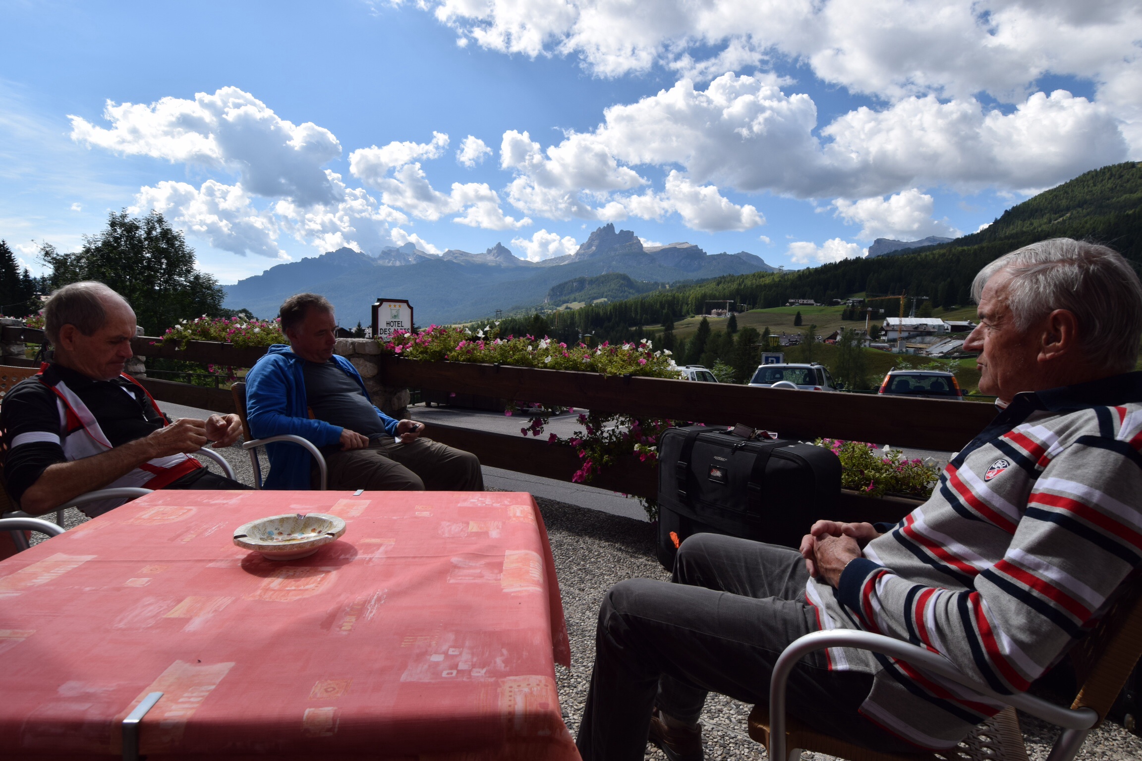 From Selva Gardina to Cortina. A short ride of 3 passes and 2000 meters of climbing. No one was interested in my offer of 6 passes and 3,500 meters of climbing to get to Cortina. Kevin, Paul and Greg know the latter route well. If I recall correctly it was so tough Kevin and Greg had to stop on pass 5 and fortify themselves with a few sips of Cognac before tackling the final pass. They only got in at 7.00 that night. Only one cognac?