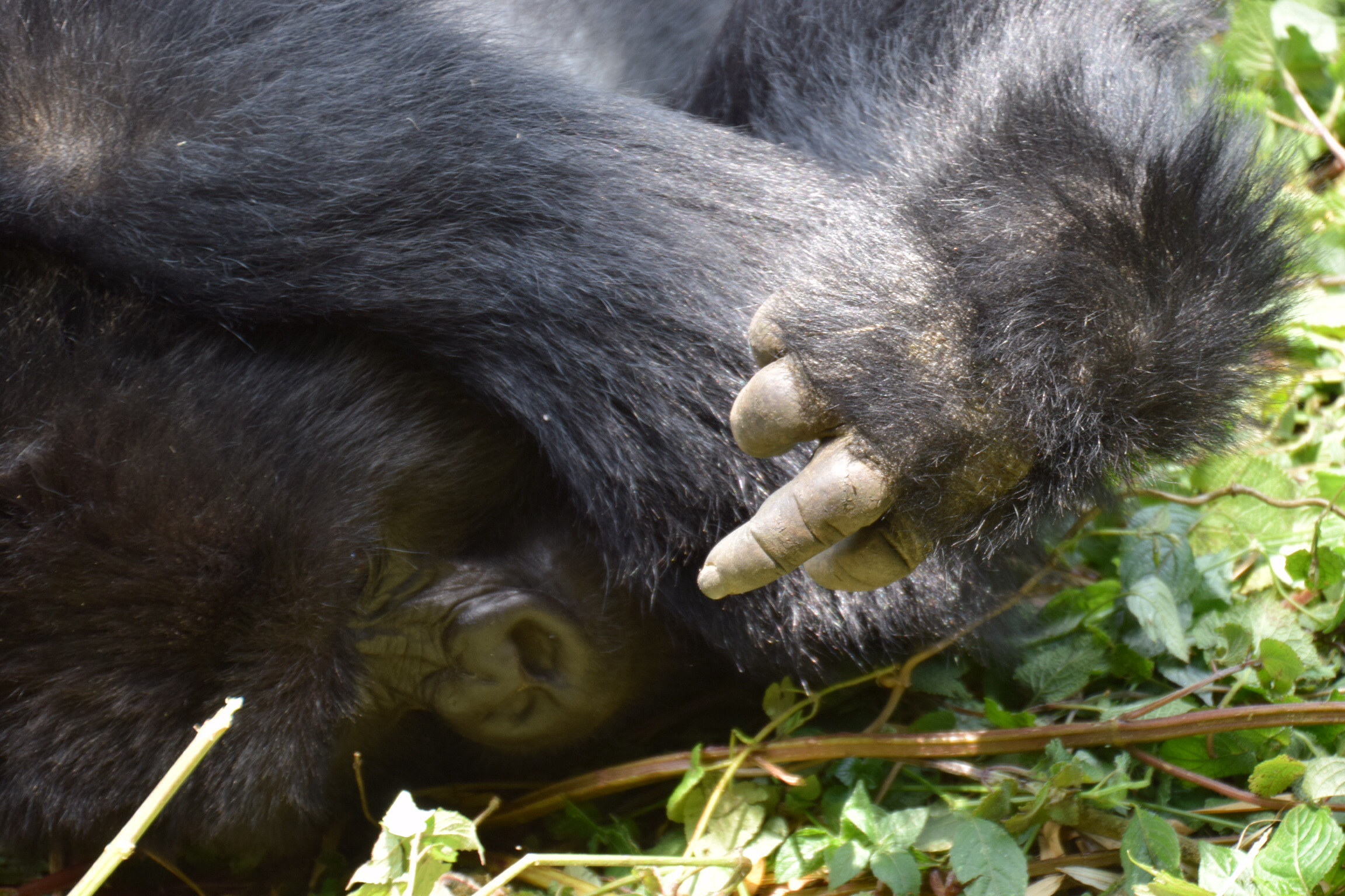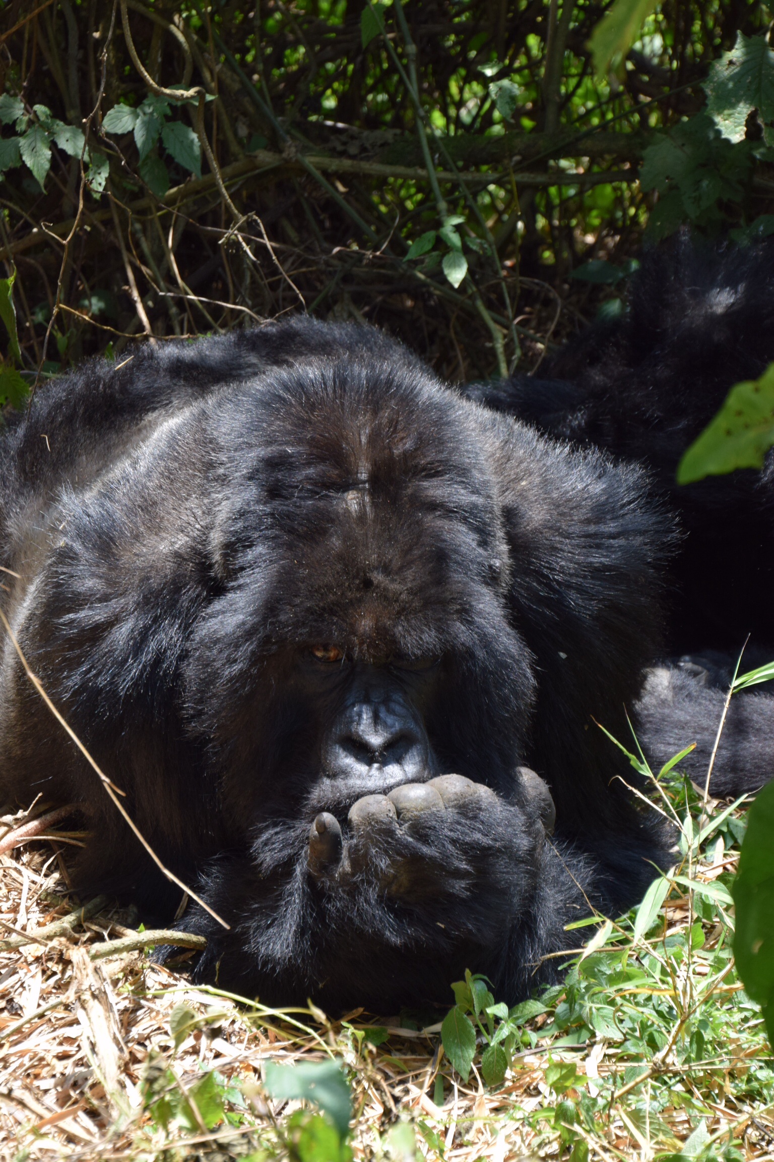 Peter points out a poster of my gorilla, lying head rested on his hands, just like in my photos.