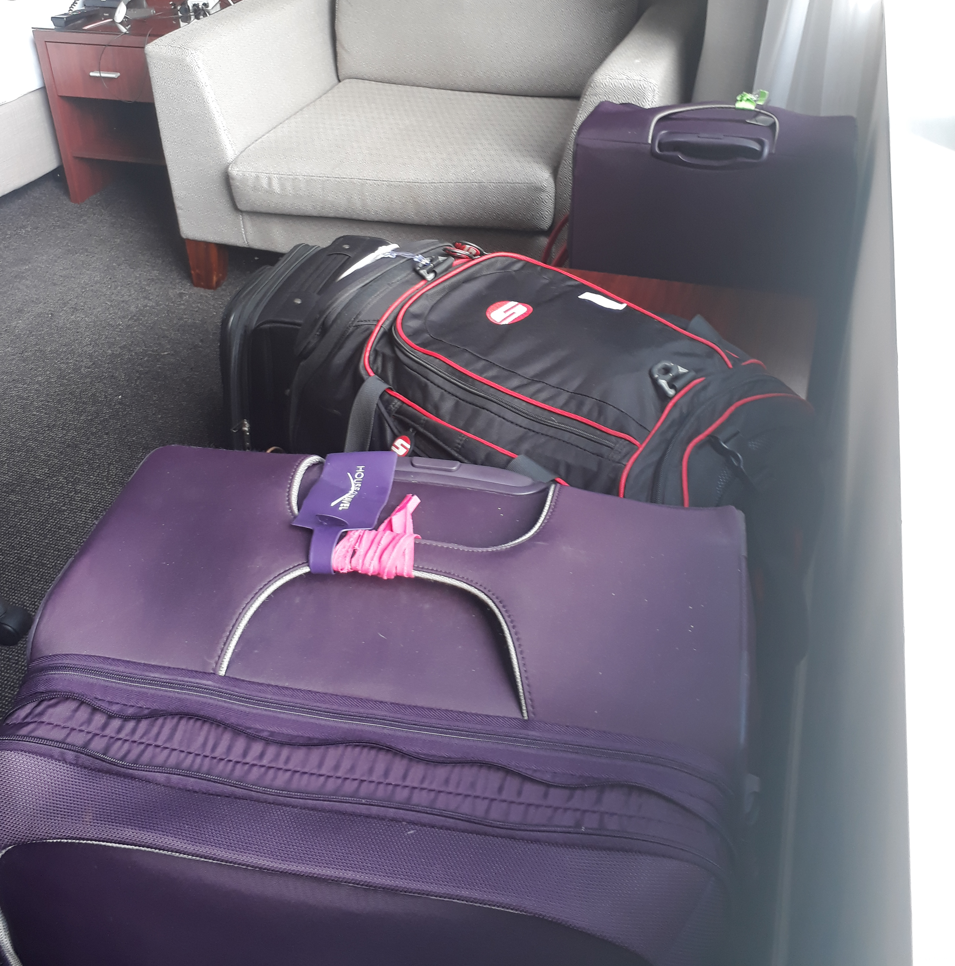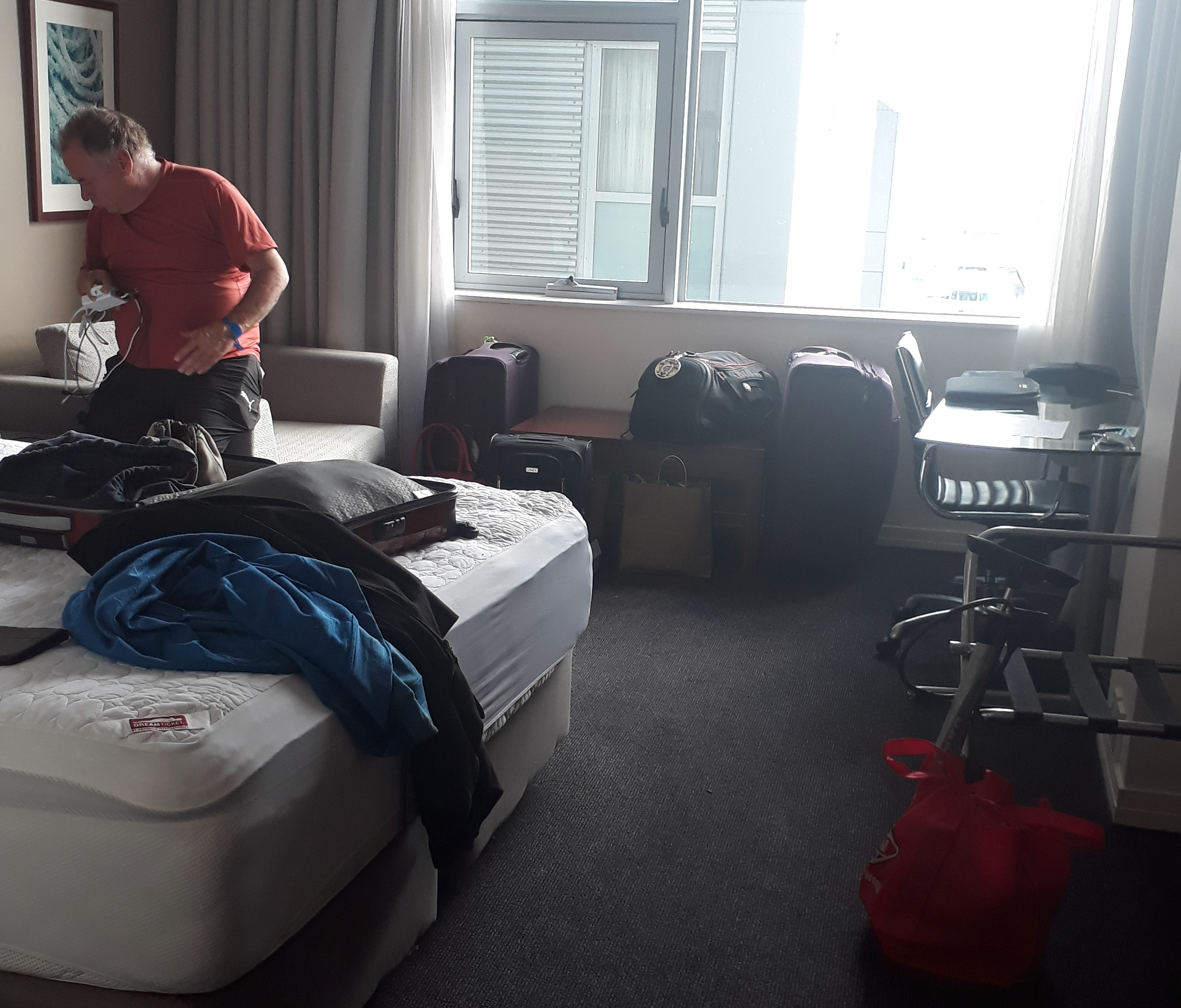 You’re on your own getting your luggage to the lift and down to the lobby – once there, the army guys are standing by to help, which was awesome. We had a LOT of luggage – 3 checked suitcases and 2 cabin suitcases, plus handbags, 2 bags of leftover food & drink (I wasn’t about to abandon my beautiful supply of cheese), the bucket of cleaning materials I’d bought to keep our space habitable, the bicycle, windtrainer (super heavy) and back with footpump and cycling shoes.